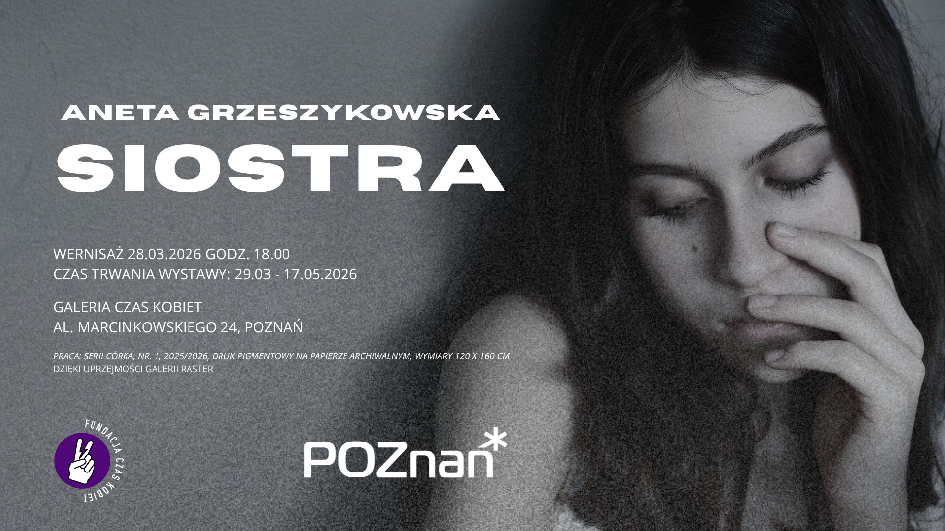 Pierwsza w Poznaniu, indywidualna wystawa Anety Grzeszykowskiej, jednej z najważniejszych i najbardziej aktywnych obecnie polskich artystek, jest połączeniem dwóch cykli fotograficznych: „Mama” (2018) i „Córka” (2025-2026). Oba, podobnie jak i cała twórczość artystki, mają charakter performatywny, są oryginalnym i radykalnym ćwiczeniem na oswojonych społecznie
